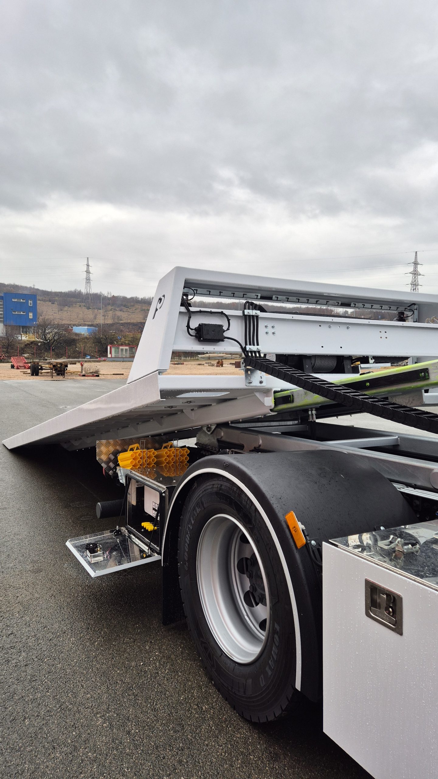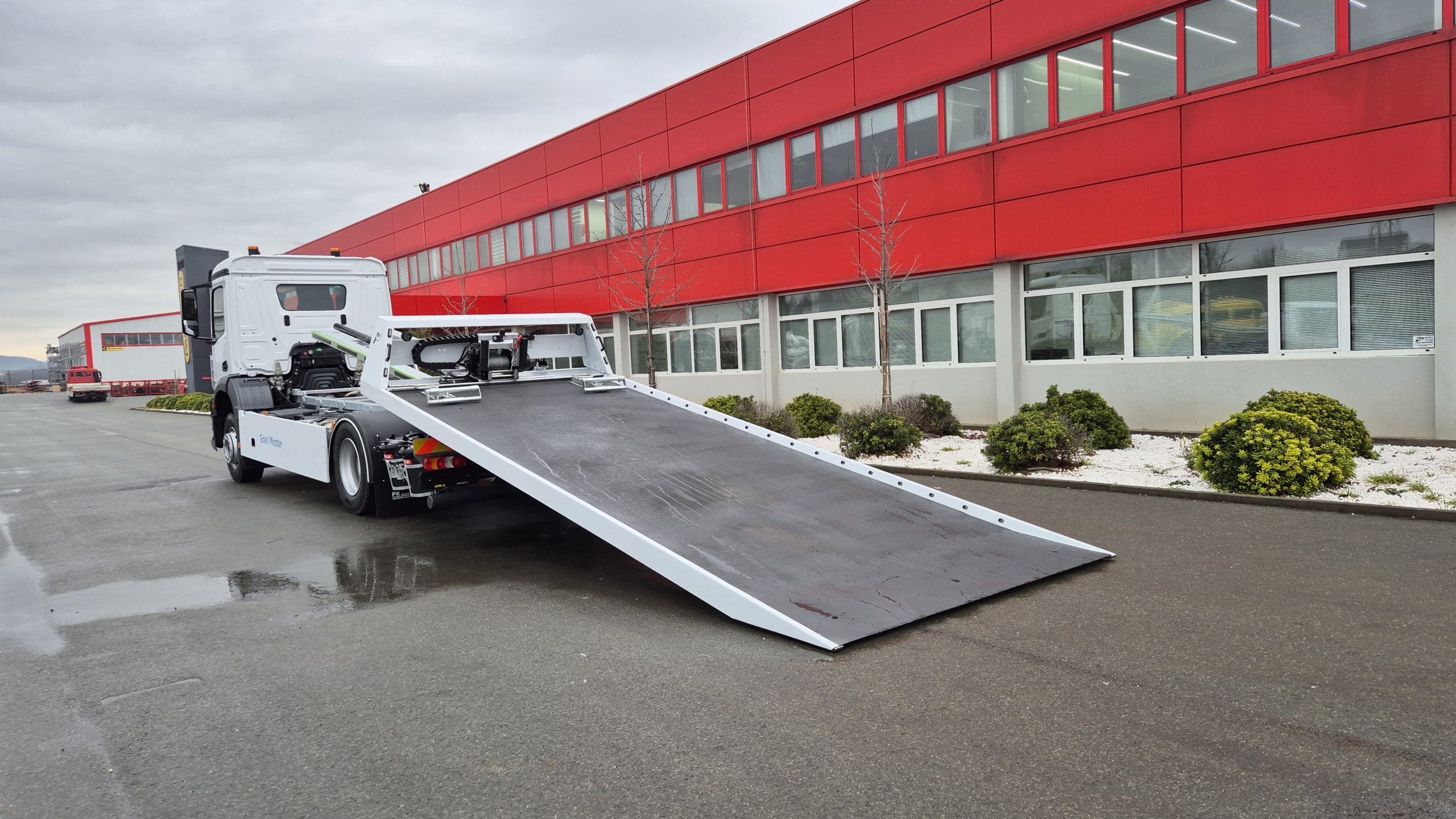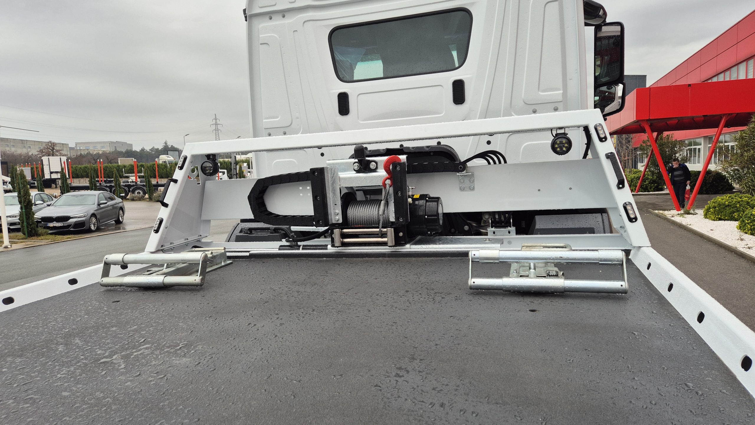Klizna platforma ima dimenzije 5.850 x 2.400 mm te je konstruirana sa dva cilindra za podizanje platforme i jednim kliznim cilindrom. Opremljena je sa zaštitnim prednjim zidom, integrisanim podmetačima točkova, LED reflektorima te hidrauličnim pomičnim vitlom potezne sile 5.000 kg i sajlom dužine 25 m. Upravljanje platformom obuhvata šest funkcija koje omogućavaju podizanje i spuštanje platforme, izvlačenje i uvlačenje vitla te pomicanje vitla lijevo ili desno. Nadogradnja uključuje kutiju za alat od nehrđajućeg čelika sa LED osvjetljenjem.